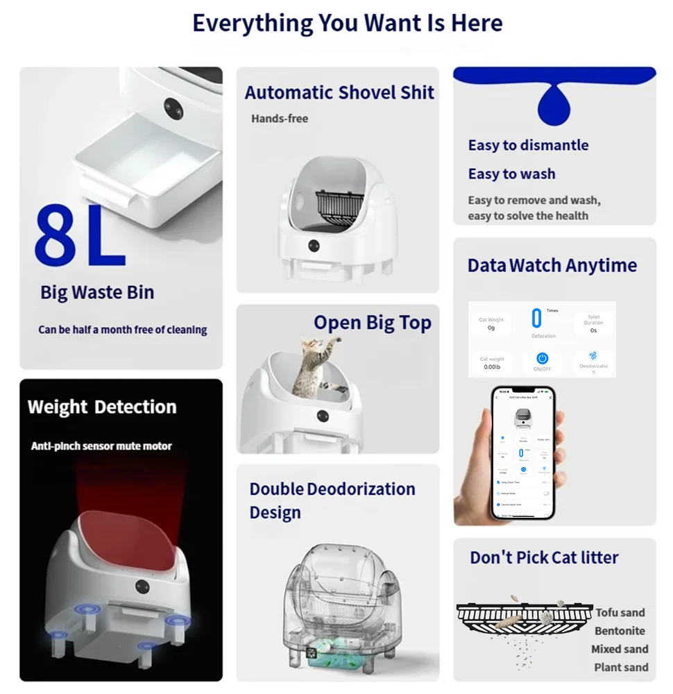 HEYBO PET Large Capacity Self Cleaning Cat Litter Box Safety App Control Odor Free Waste Bin Auto Smart Open Cat Litter Box
